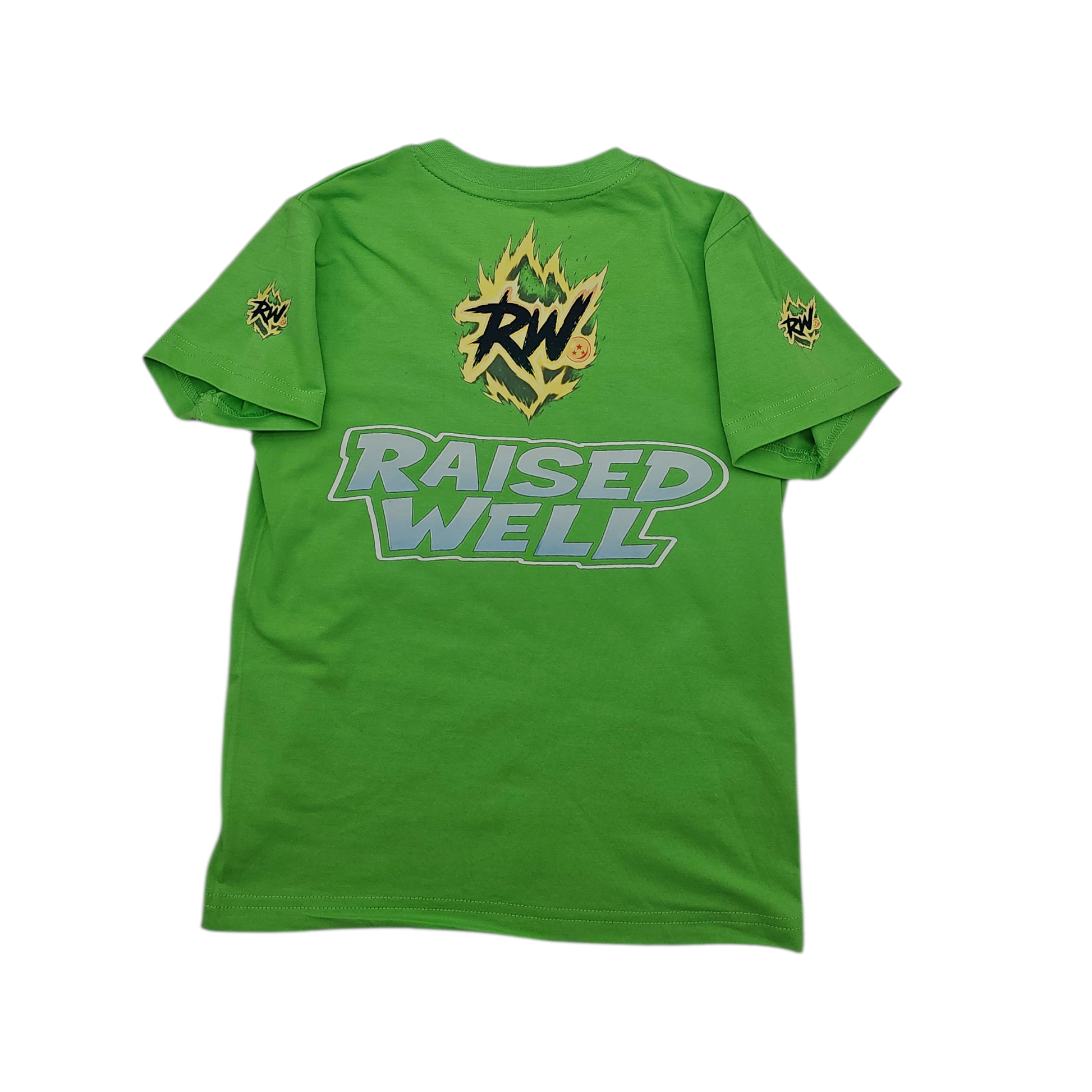 Unleash bold energy with the Raised Well Kids' Action Tee, designed to inspire confidence and movement. This vibrant green shirt features three dynamic cartoon-style characters with glowing eyes and heroic poses, surrounded by electrifying energy bubbles. Centered below the artwork, the bold “RAISED WELL” text makes a powerful statement, while the smaller logo beneath adds a touch of brand authenticity.